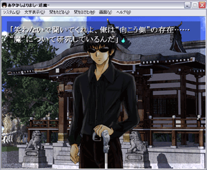 ■鏡(かがみ) “妖”の事を“魔”と呼び、研究する長身の 盲目の男。 その目が原因か、見えないものを感じ取る 事が出来る。 “魔”に対し、 ある種の執念のような、深い 憎しみを持っており、 修一郎に協力を 呼びかける。 |